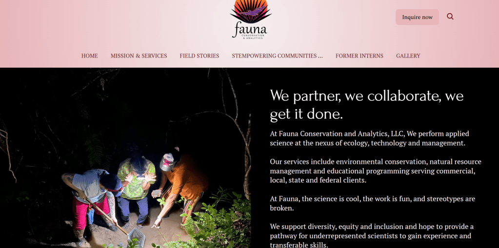 This fall, I had the amazing opportunity to intern at Fauna Conservation and Analytics, LLC. During my time there, I got to manage the company’s website and take on a variety of other tasks. In this post, I’ll share my experience, what I learned, and how this internship helped me grow both professionally and personally.